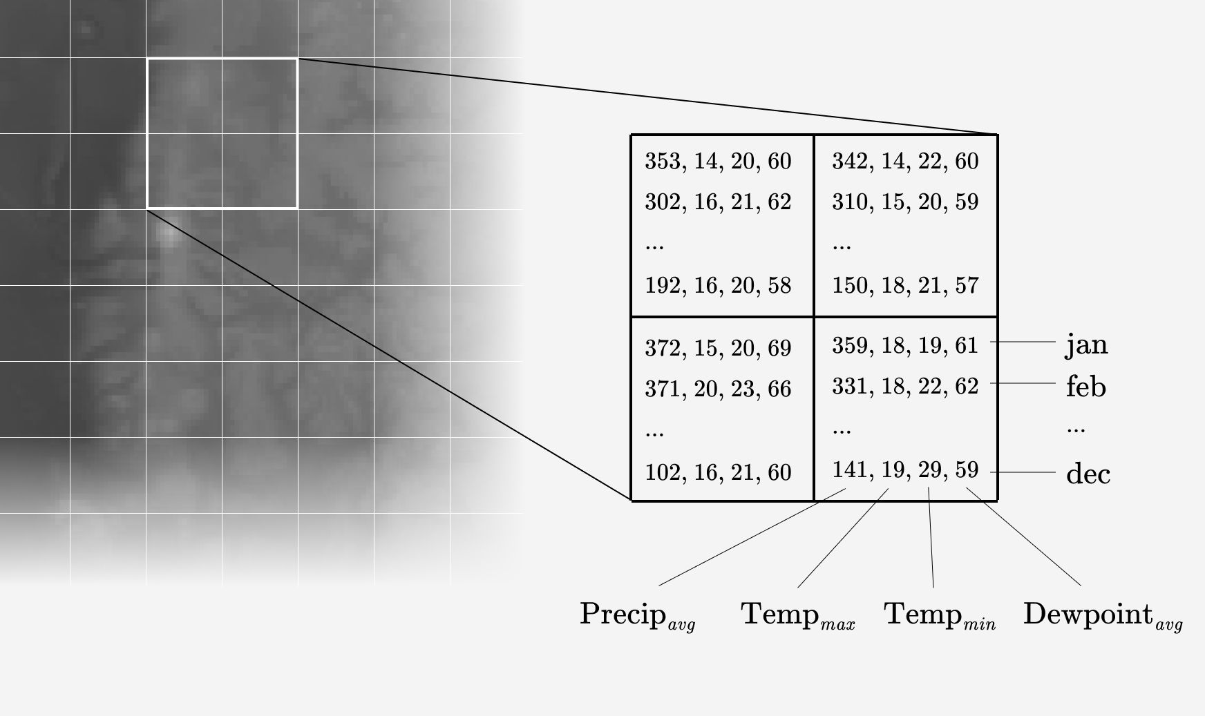 Here’s the approach I used: suppose you take a grid and placed it over the earth. Then you collect climate metrics for each grid cell. Metrics such as precipitation, max temperature, min temperature, and dewpoint. Each of these metrics are averaged for each of the 12 months. So each cell is represented by a two dimensional array: one dimension is the metric and the other is each month.